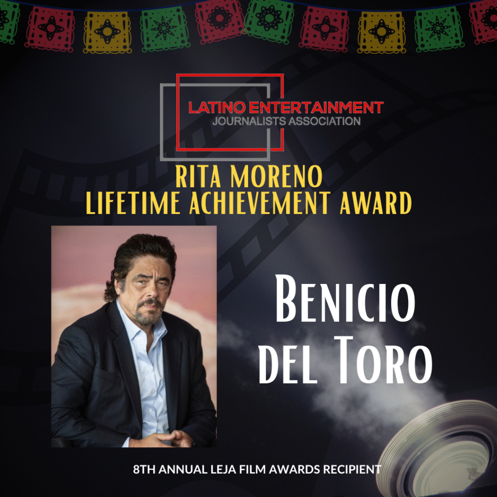 LEJA is also honoring actor Benicio del Toro with this year’s Rita Moreno Lifetime Achievement Award. Past winners include Rita Moreno (2019); Jennifer Lopez (2020); Rosie Perez (2021); John Leguizamo (2022); Guillermo del Toro (2023); Eugenio Derbez (2024); and Edward James Olmos (2025).
